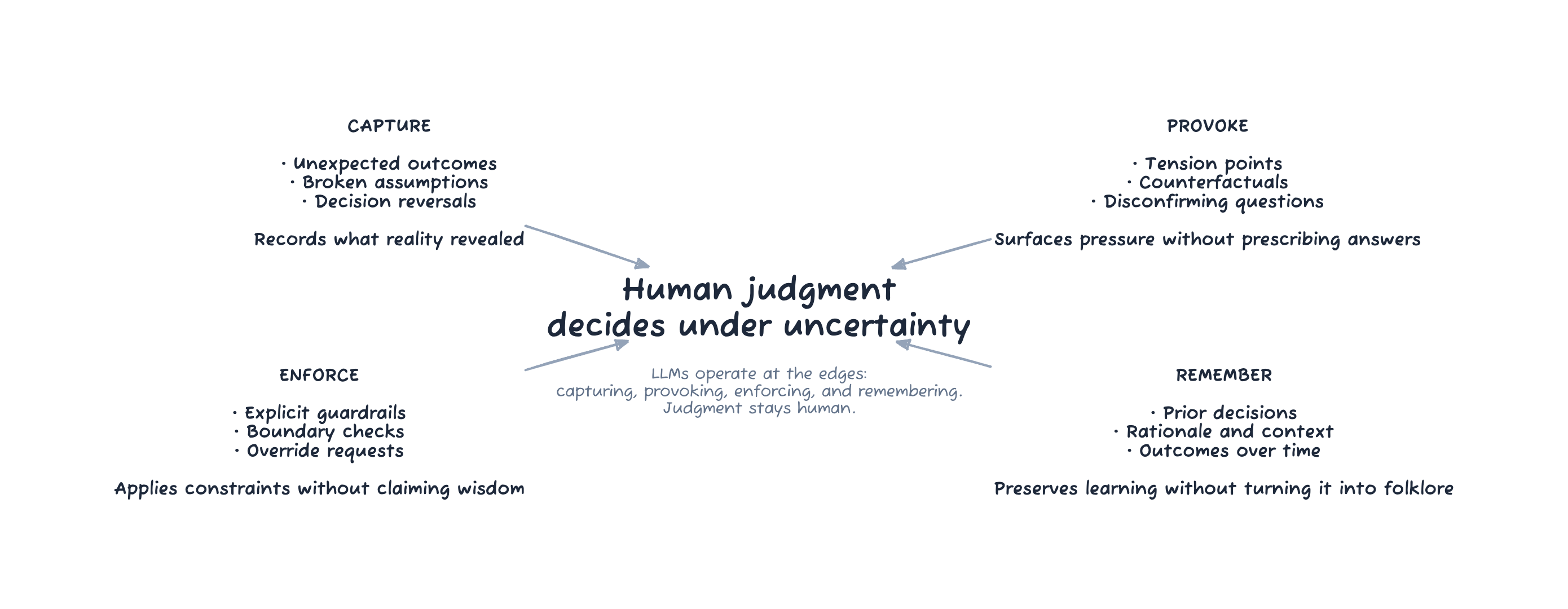LLMs are very good at noticing contradictions, summarizing surprises, extracting decisions and rationales, and turning messy logs into structured notes.